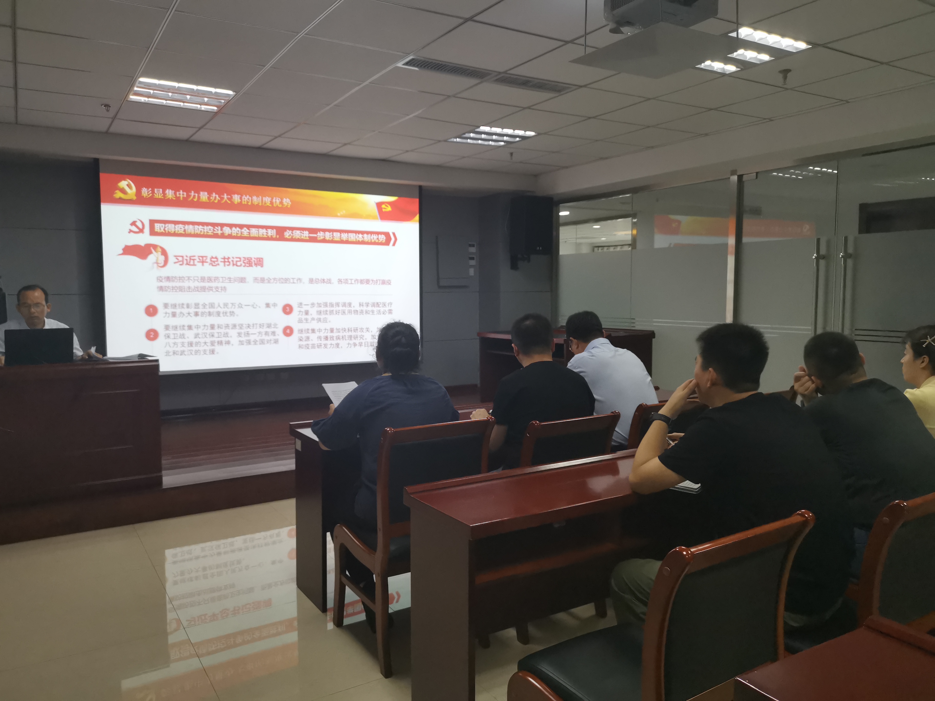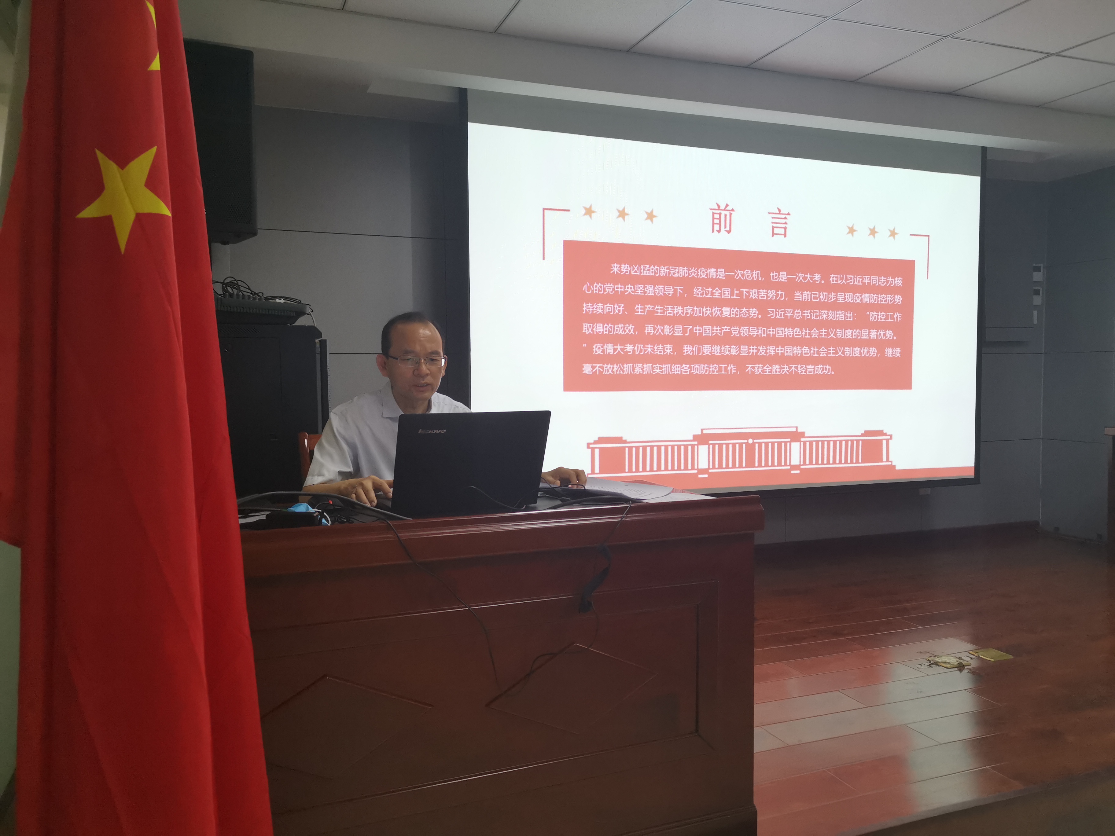 2020年7月2日上午,中共facebook官网第二支部委员会支部书记焦俊良同志以“在大考中彰显中国特色社会主义制度优势”为题,为全体支部党员和入党积极分子上了一堂别开生面的党课。