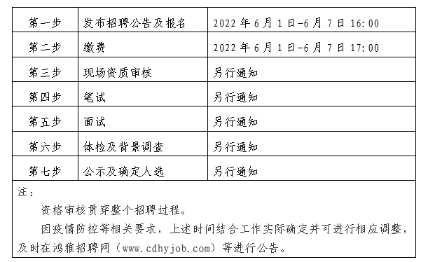 2022年6月1日至2022年6月7日16:00 在鸿雅招聘网(http://www.cdhyjob.com/)、鸿雅微信公众号、facebook官网集团官方网站(/)及上级部门要求的相关网站等发布招聘公告。