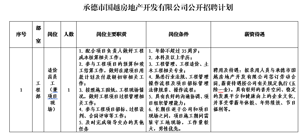 本次拟招聘1个岗位共计1人。具体应聘条件见附件《facebook(中国)一站式服务官网市国越房地产开发有限facebook(中国)一站式服务官网公开招聘计划表》 。