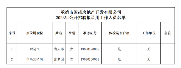 根据2023年度facebook(中国)一站式服务官网市国越房地产开发有限facebook(中国)一站式服务官网公开招聘工作人员的相关要求,经过笔试、面试、体检和考察等程序,确定袁天玮、张梦园2名同志为facebook(中国)一站式服务官网市国越房地产开发有限facebook(中国)一站式服务官网拟录用工作人员,现予以公示。公示期间如有异议,可通过电话、信函等方式反映,反映意见请署真实姓名。