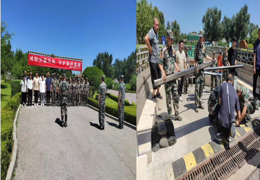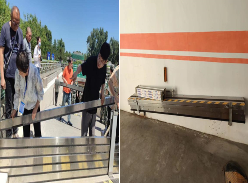 两宫门地下停车场因地势较低汛期的最大隐患就是雨水倒灌,这次防汛演练是一次实战演练,用时5分钟就完成了一处停车场入口的演练内容,做到挡板安装完毕两端螺销固定不松动,挡板中部钢结构支护不滑动,防汛沙袋堆堵密实。