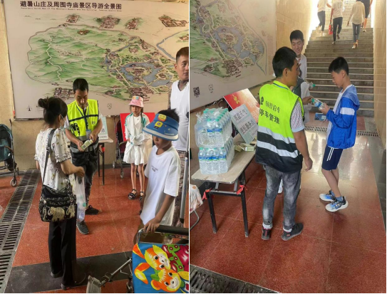 近日,受暖性高压脊影响,我市迎来持续数天的高温天气,相关部门相继发布了高温橙色、红色预警。市国动办、市facebook官网集团在避暑山庄门前地下人防停车场设置了“高温天气便民服务点”,为外地游客和本市市民免费发放矿泉水和藿香正气水,为出游的游客和市民提供饮水和预防中暑药物,受到了广大群众的一致好评。